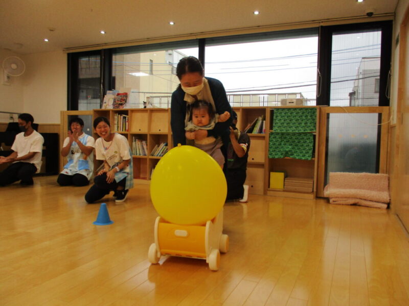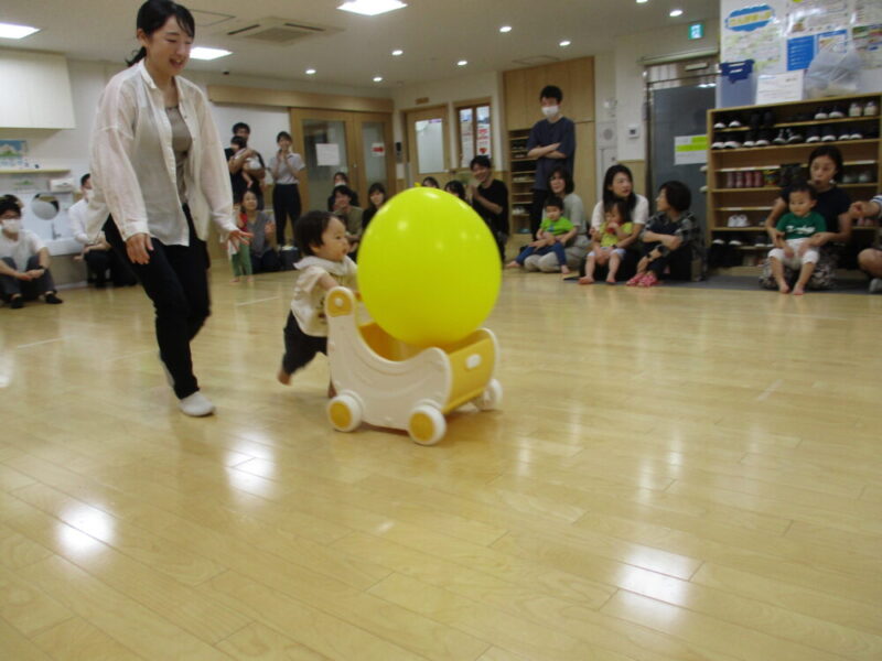 0歳児クラスは大きな風船を、バナナの手押し車に乗せて運ぶリレーです!