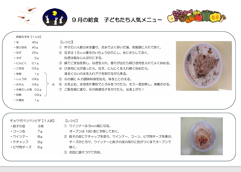「今日の給食・おやつなにかな?」と子どもたちが楽しみにしている献立が登場!ごはんが進む『さばの味噌煮』や、ちょっぴり珍しい『マカロニきな粉、食欲そそる『麻婆なす丼』、おやつ感覚でも楽しめる『餃子パリパリピザ』など楽しみながらしっかり栄養もとれる献立になっています。