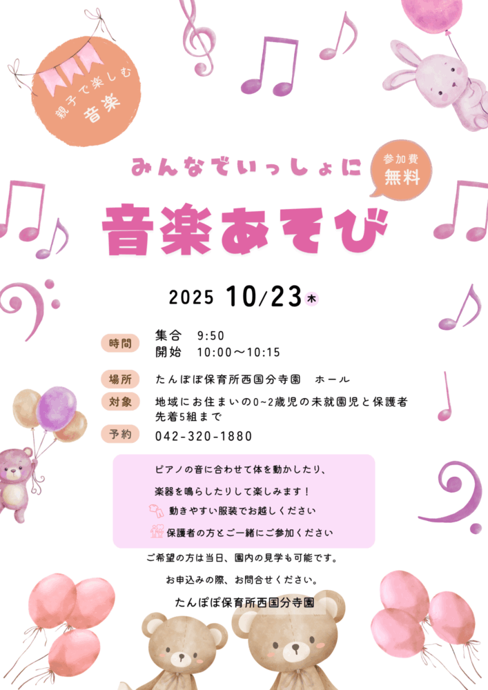 場所はたんぽぽ保育所西国分寺園のホールにて10月23日(木)の9時50分集合です。