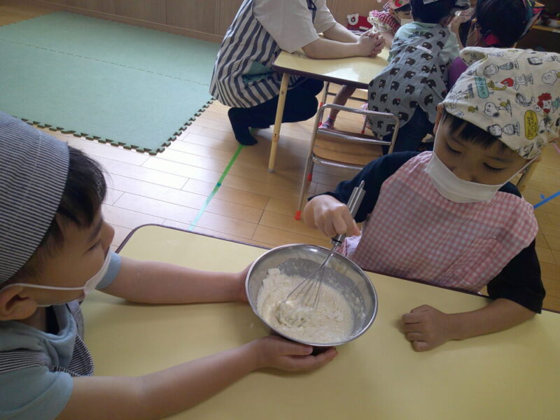 友だちと協力しながら、生地が滑らかになるまで混ぜました。ホットケーキミックスの甘い香りがして、食べるのがより楽しみなようすでした。