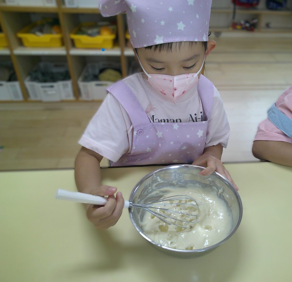 友だちと協力しながら、生地が滑らかになるまで混ぜました。ホットケーキミックスの甘い香りがして、食べるのがより楽しみなようすでした。