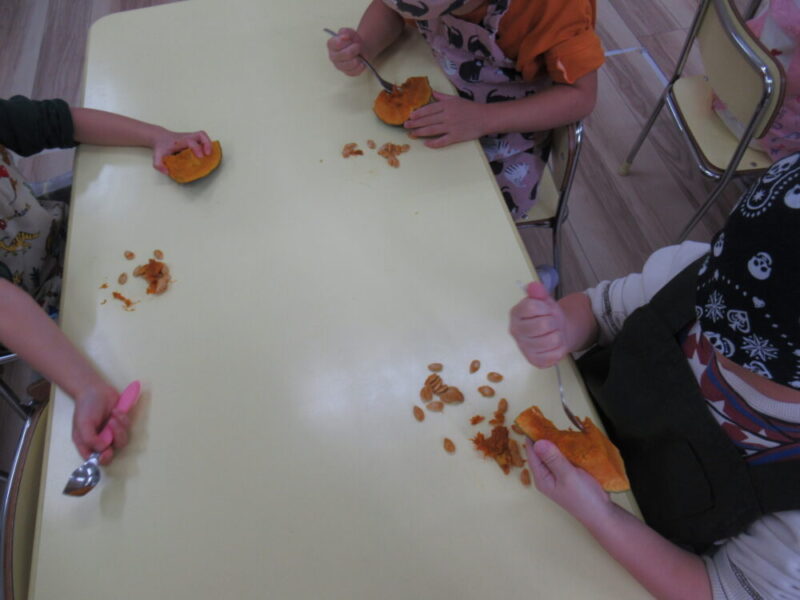 パンプキンプリンに使用するかぼちゃの種取りをきりん組さんに、