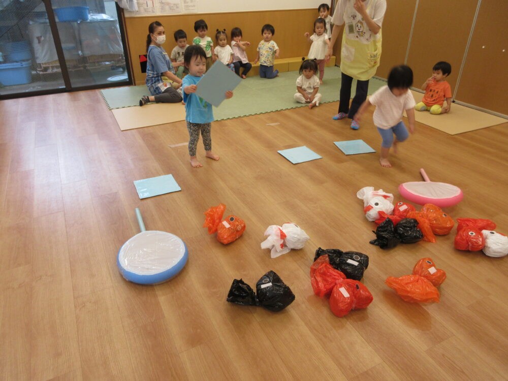 大きなポイを使ってきんぎょすくいを楽しんでいます🐟