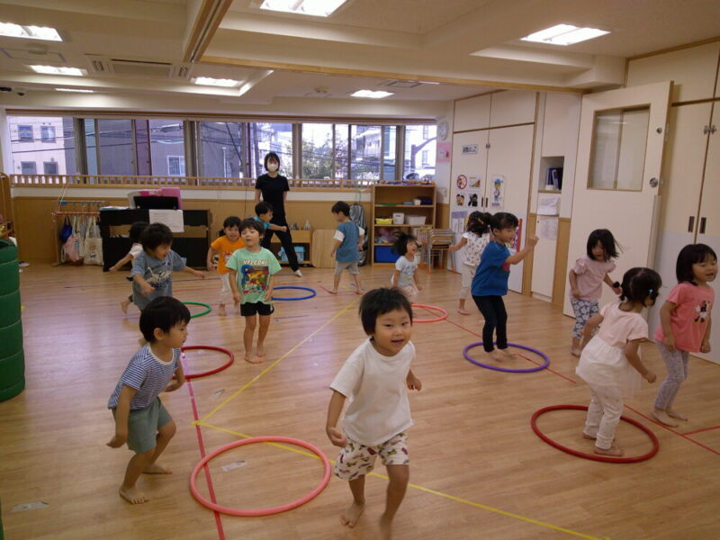 次は、1人1つフラフープを貰い、自分でクルクルと床の上で回して、フラフープの輪っかの中にジャンプします!