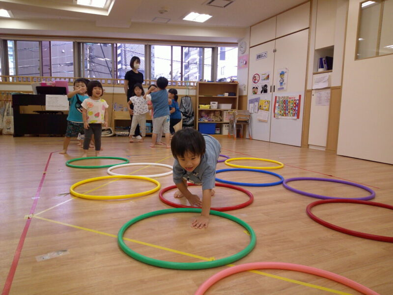 次は、フラフープの中をジャンプしたり、クマさんになりきって歩いたりしました🐻