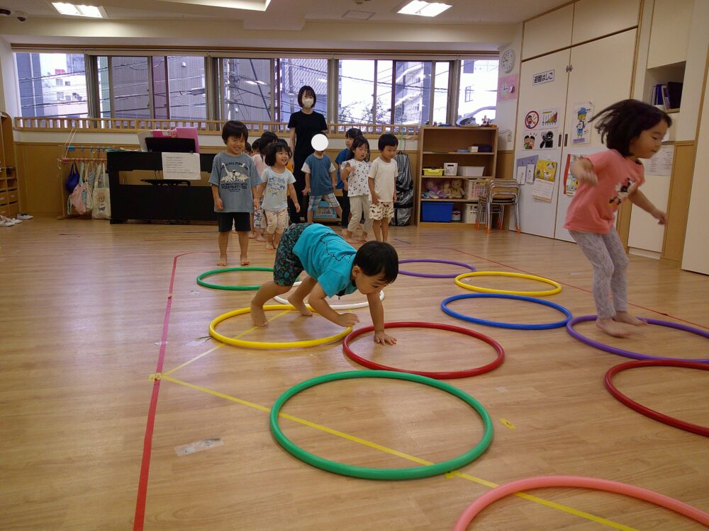次は、フラフープの中をジャンプしたり、クマさんになりきって歩いたりしました🐻