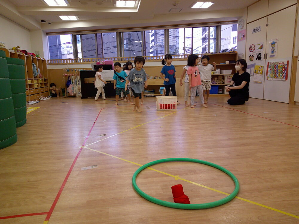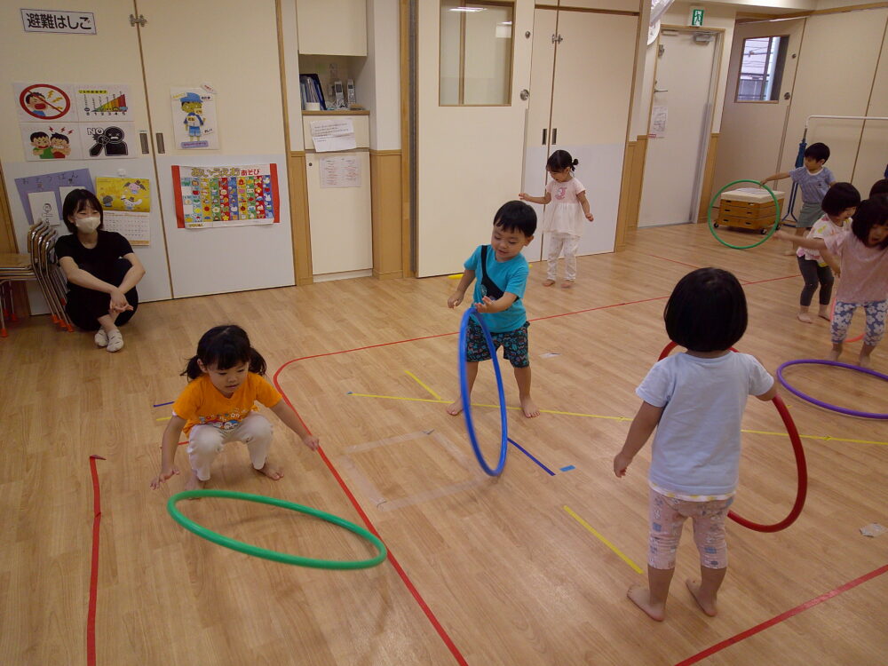 次は、1人1つフラフープを貰い、自分でクルクルと床の上で回して、フラフープの輪っかの中にジャンプします!