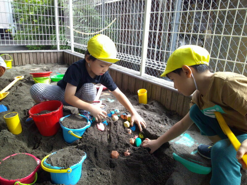 子ども達は砂が増えたことで大きな山に挑戦したり、宝探しをして砂遊びに夢中です。
