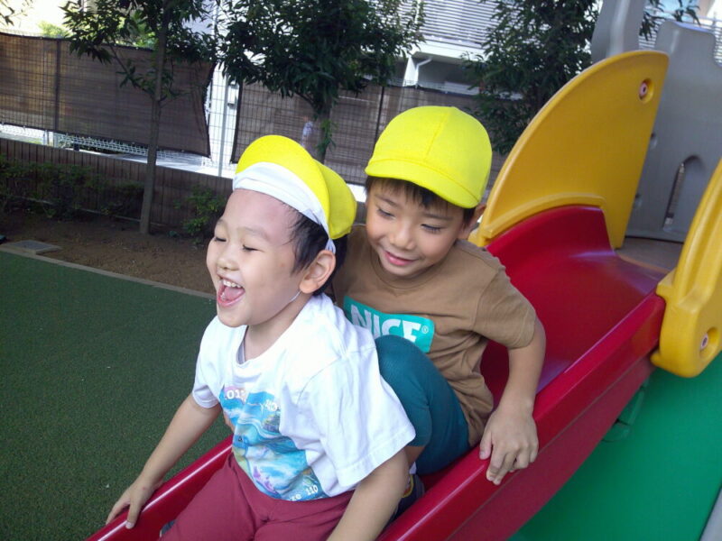 滑り台も大好き。一緒に滑ることも、下で友達が待っててくれることも、嬉しくて楽しいつき組さんです。