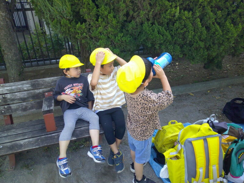 疲れたり、喉が渇いた時は自分から休憩、水分補給を大切にしています。ベンチに座ってお友達の姿を見たり、何してるんだろうね、など会話することも楽しんでいます。