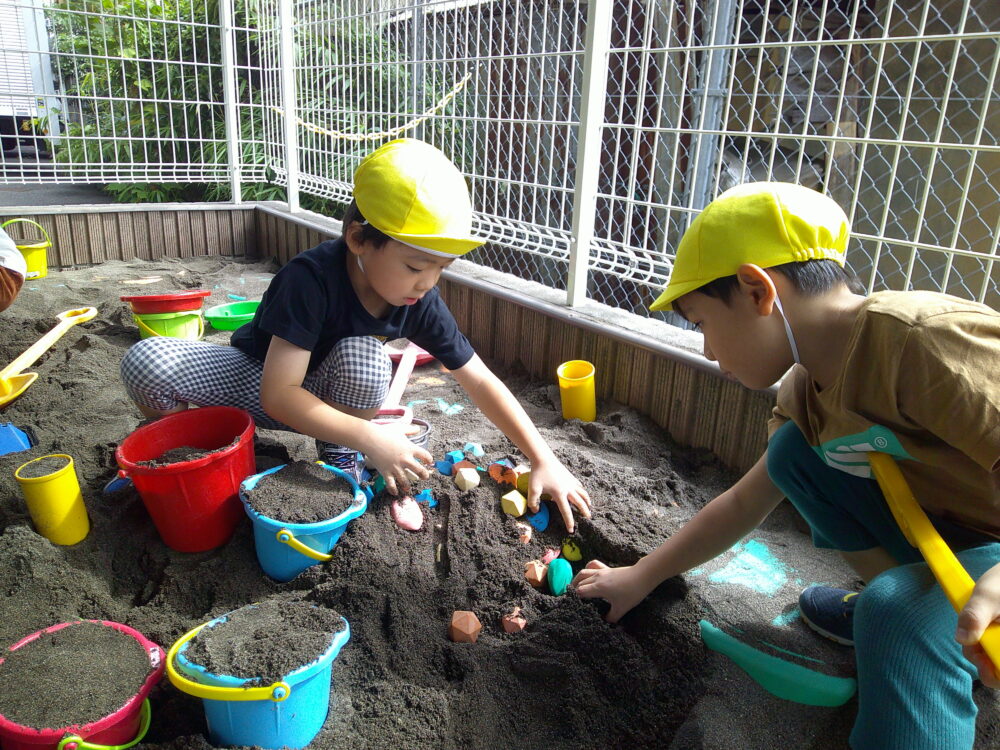 子ども達は砂が増えたことで大きな山に挑戦したり、宝探しをして砂遊びに夢中です。