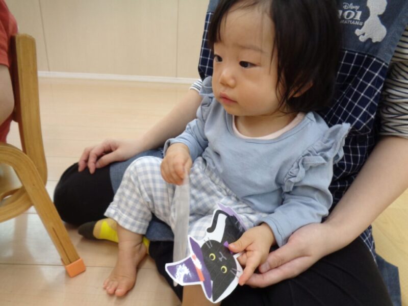 ハロウィンにちなんだキャラクターのカードを見ながらハロウィンソングを聞いたりしました。黒猫ちゃんを見ると、「にゃんにゃん!」と嬉しそうに手に取るお友だち🐈♡