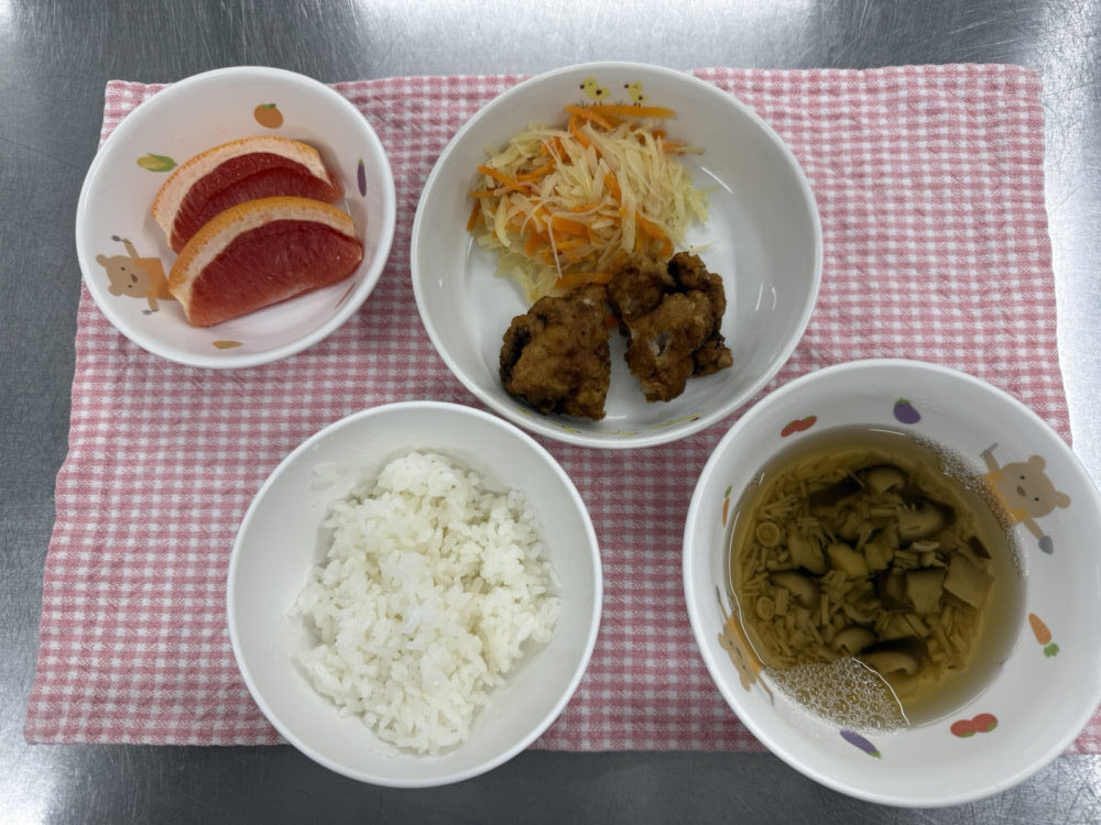 献立はごはん、山賊焼き、いもなます、きのこ汁、フルーツ です。