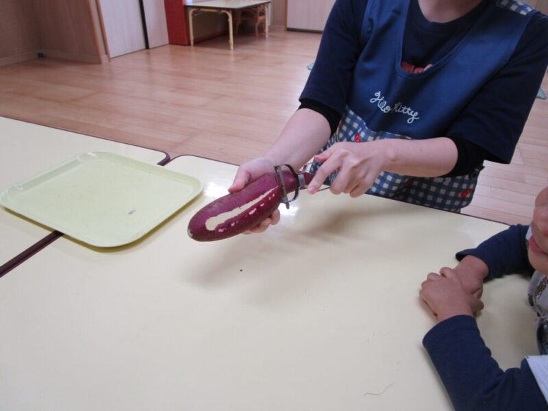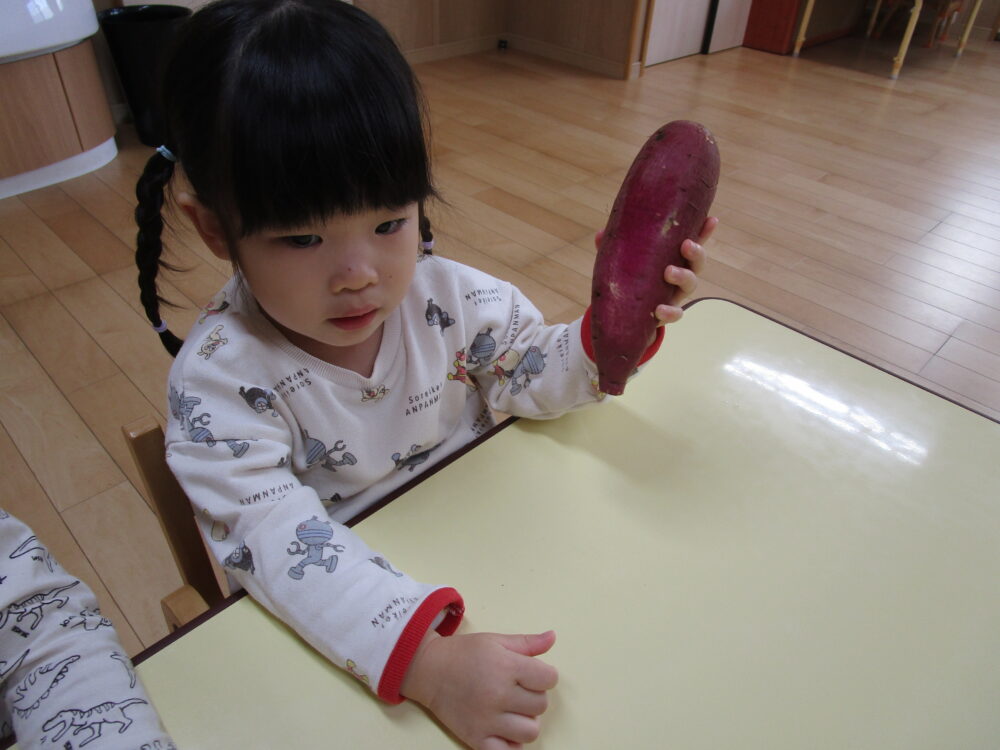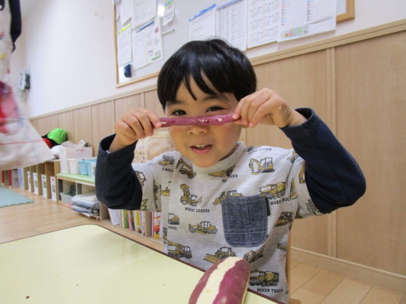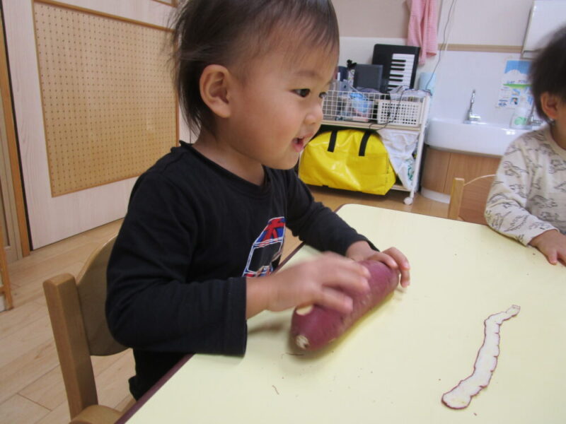 皮の匂いを嗅いでみたりとサツマイモの食育を楽しんでいました。
