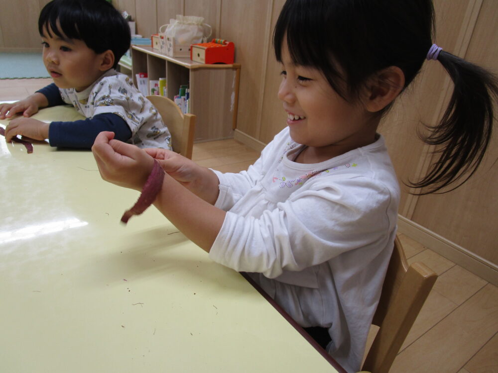 サツマイモを触ったり、皮と中身の色の違いを見ました。