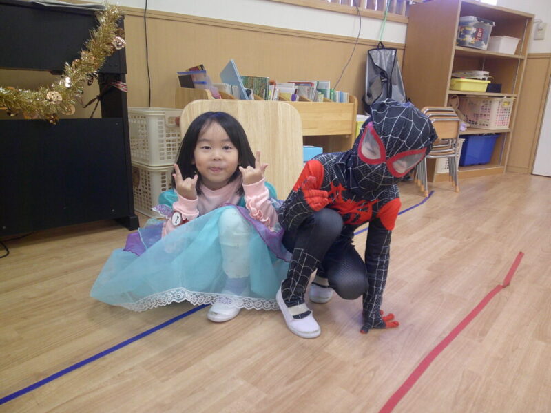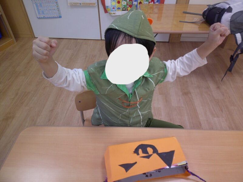 園長先生に「トリックオアトリート!」と大きな声で伝えると仮装した園長先生が登場‼️‼️「かっこいい~」と声をそろえて言っていました🤩