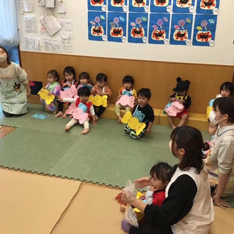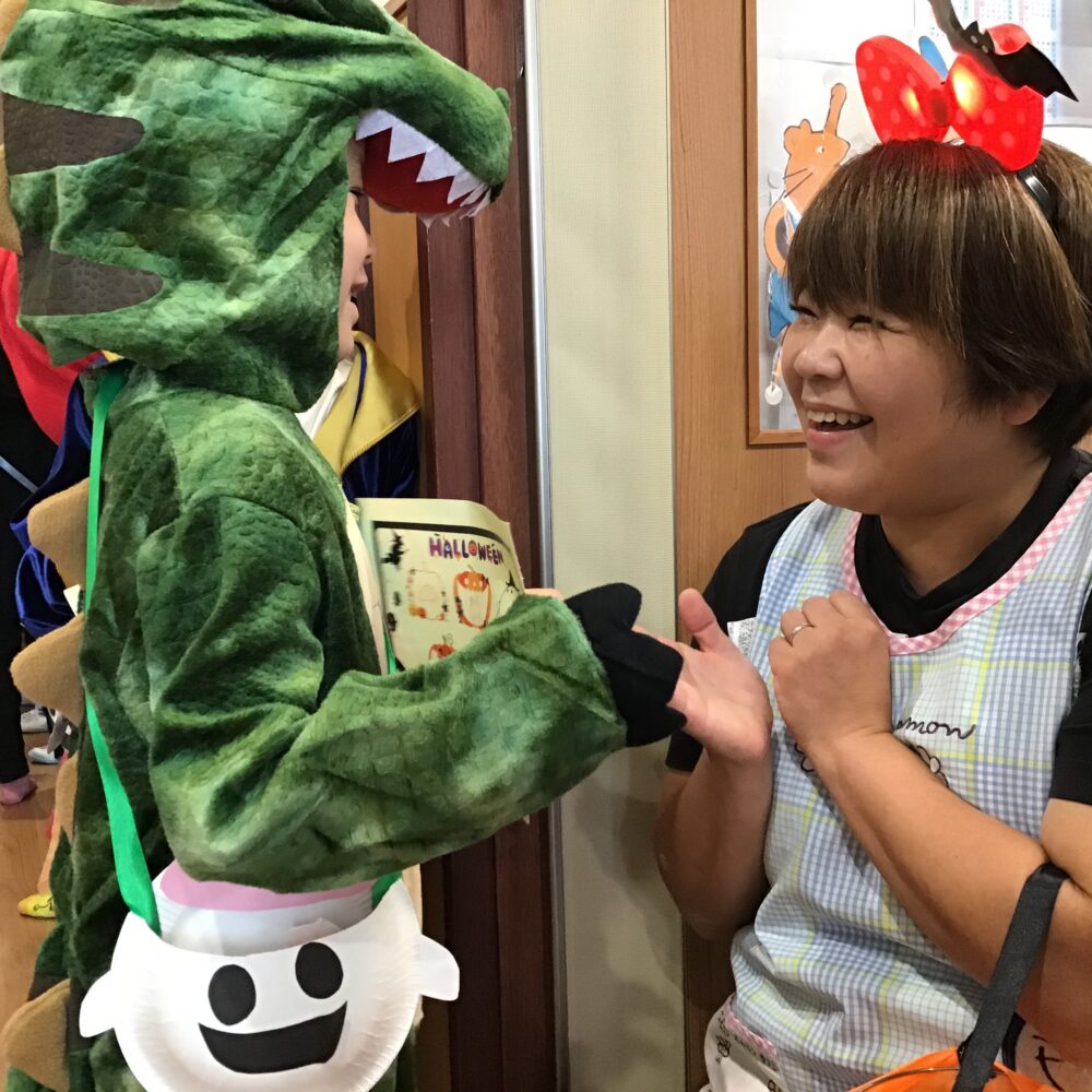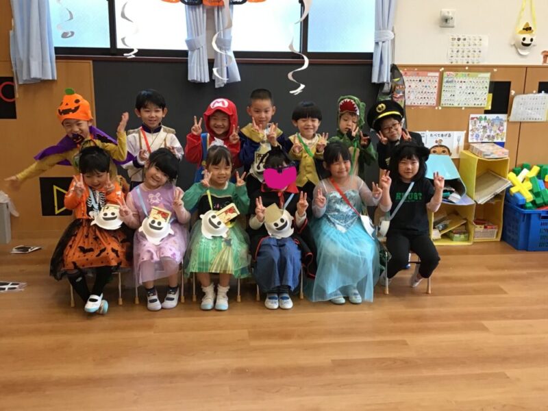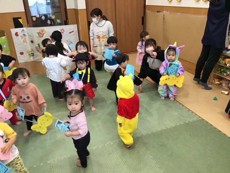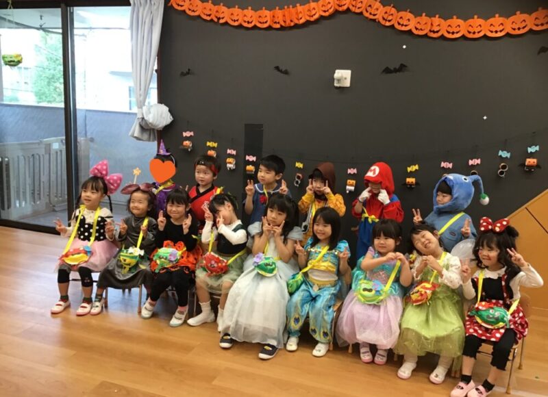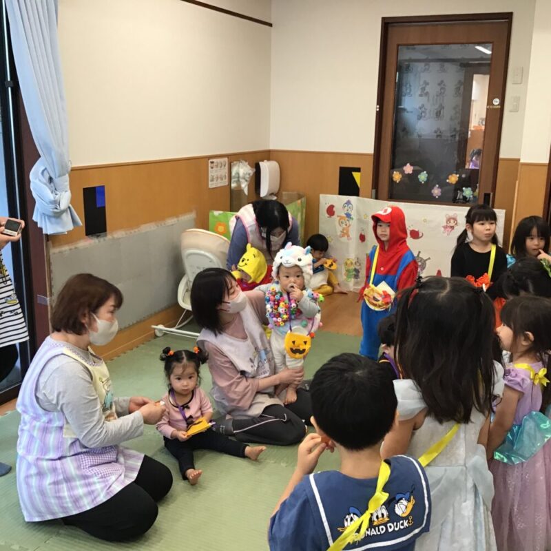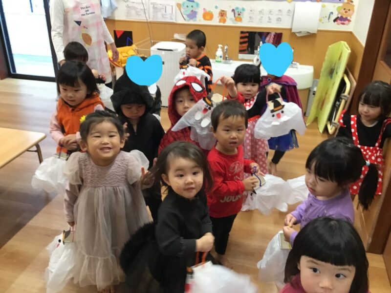 各クラスを回り、『おかしをくれないといたずらしちゃうぞぉ~』と言いながら、折り紙で出来ている、クッキー🍪やオバケキャンディーをもらい嬉しそうにしていました。幼児クラスのお友だちは「Trick-or-treating」としっかり言えるお友だちもいました。