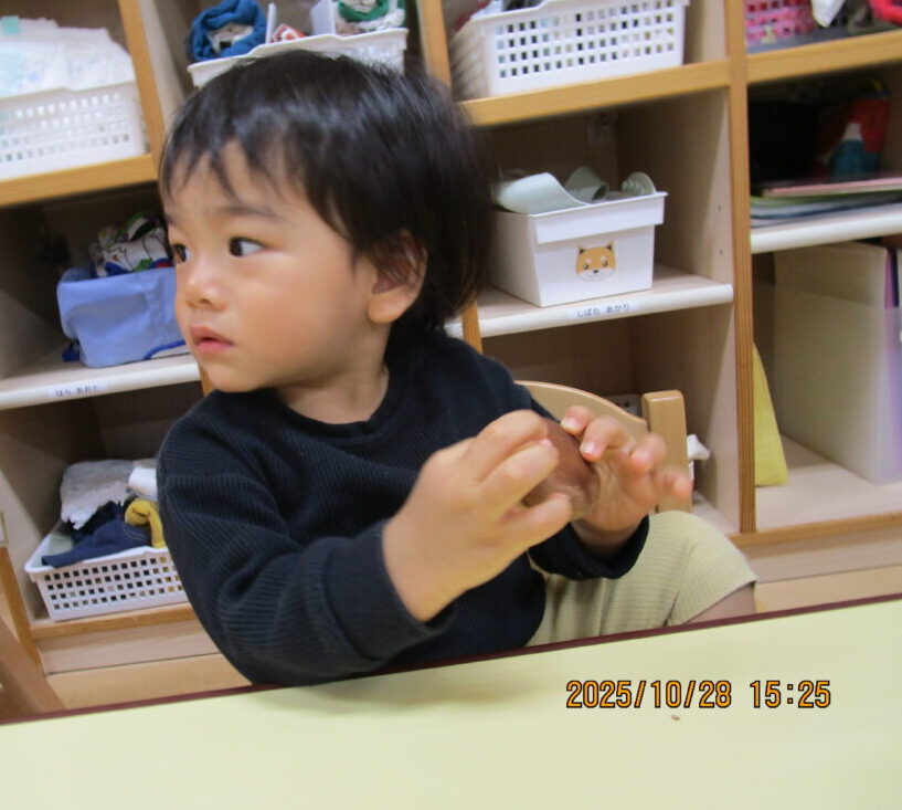 栄養士に調理されていないしいたけを見せてもらうと、不思議そうにじーっと見つめていました。