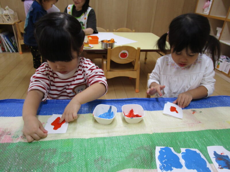 デカルコマニーという紙を半分にして片方に絵具を付けて乾く前に半分に折り広げる技法をしました。初めての製作技法でどうなるか不思議な子どもたち。