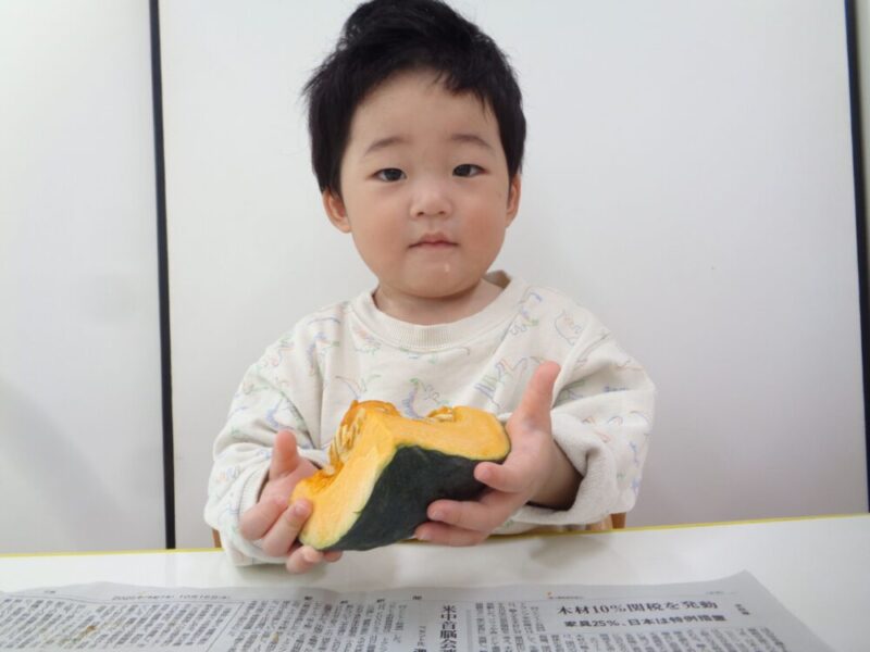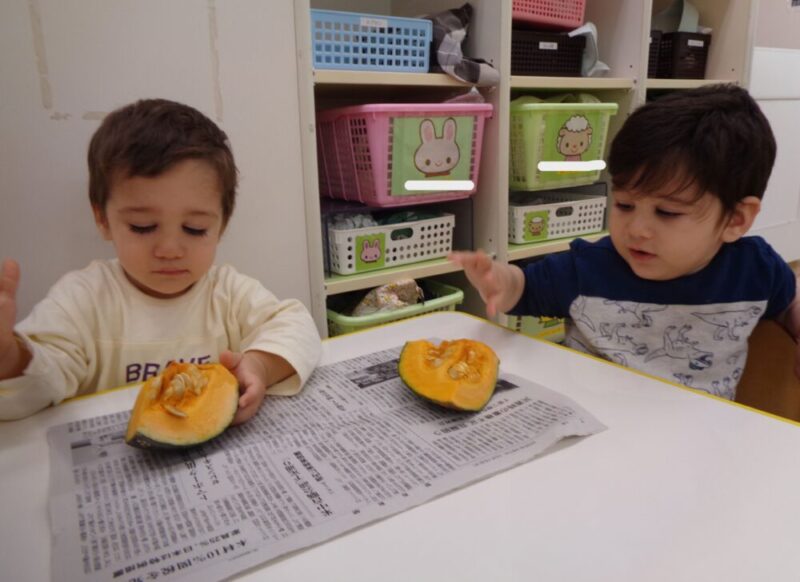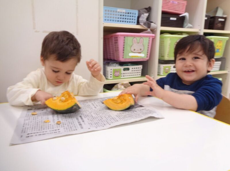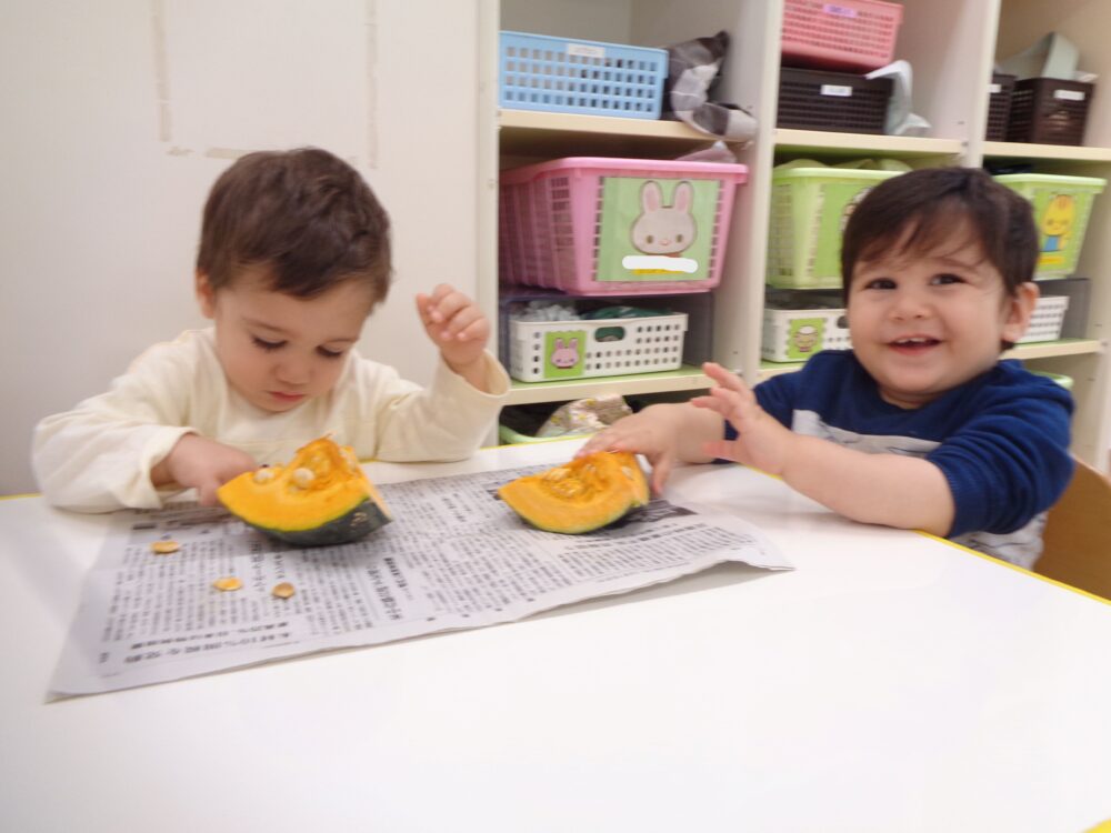かぼちゃに沢山触れて色々な表情を見せてくれていたひよこ組さんでした🐤💕次の食育も楽しみだね♪♪