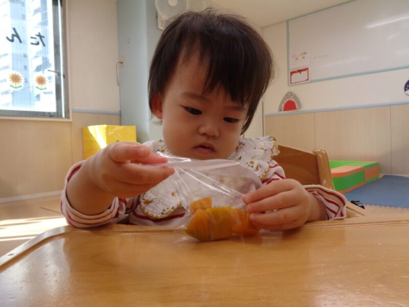 次は柔らかく煮たかぼちゃを袋に入れて触ってみました♪なんだか不思議そうな表情ですね…😊★