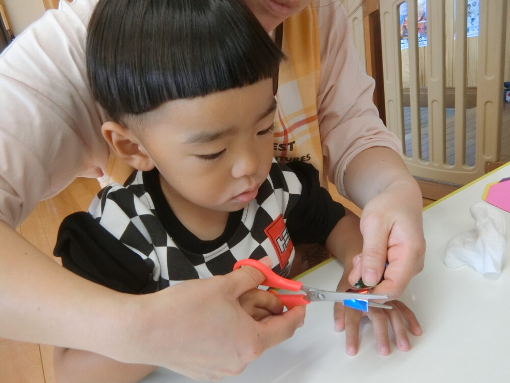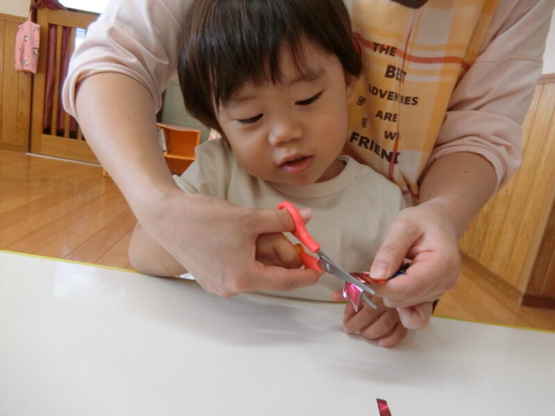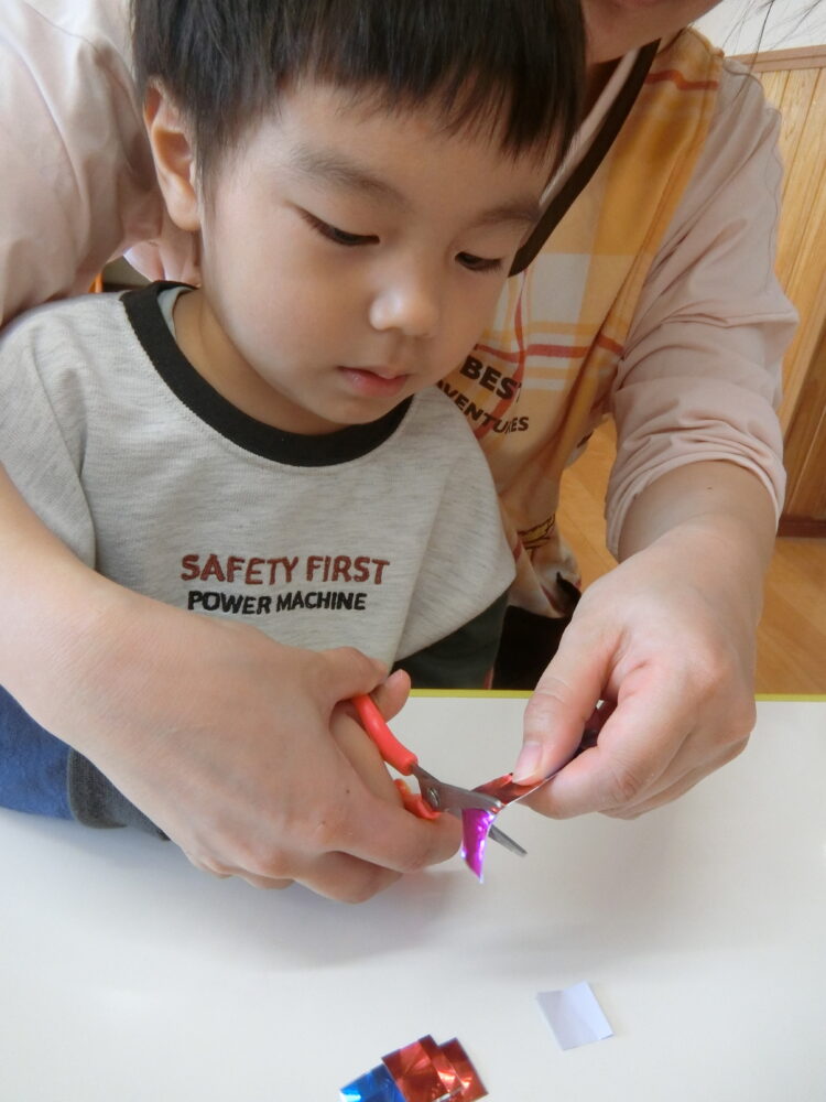 保育者と一緒にハサミを持ち、真剣な様子で折り紙をチョキっ!