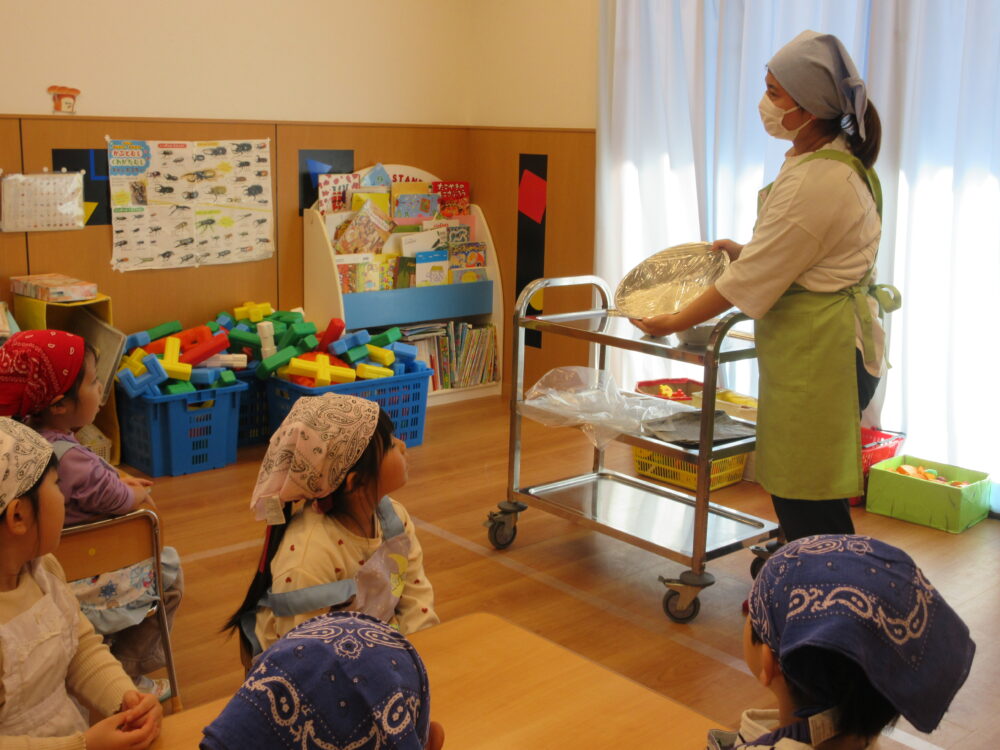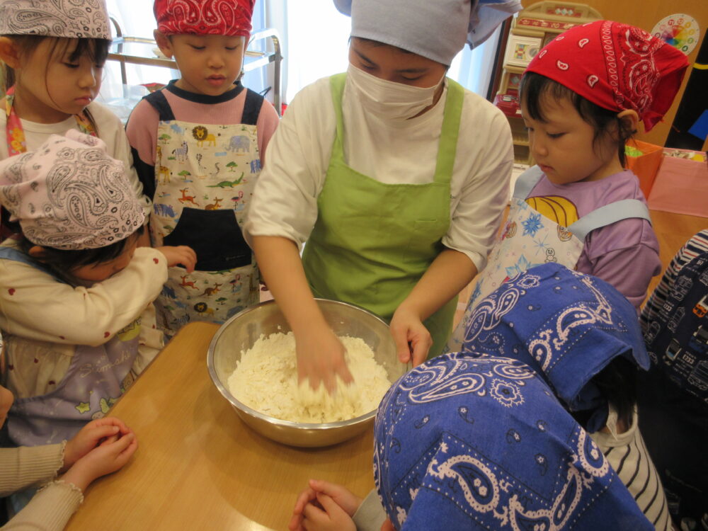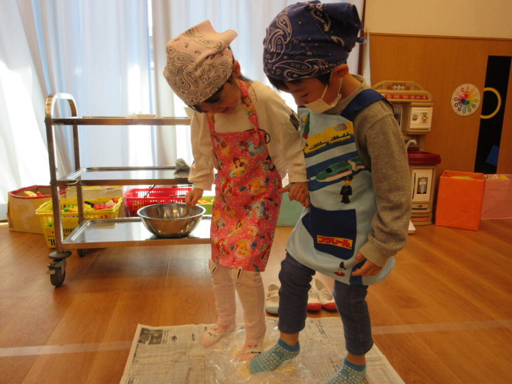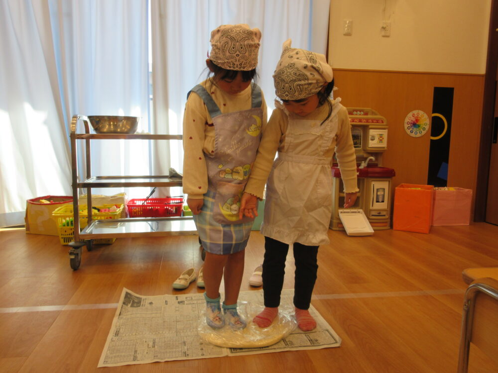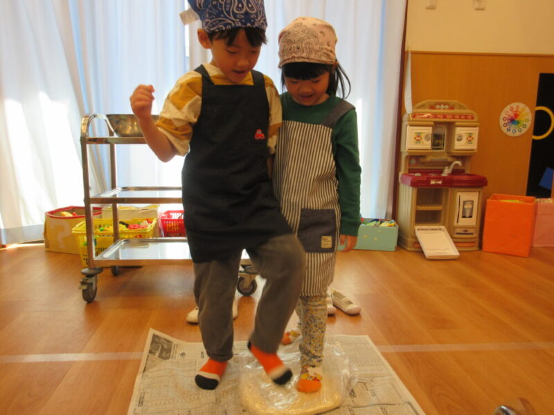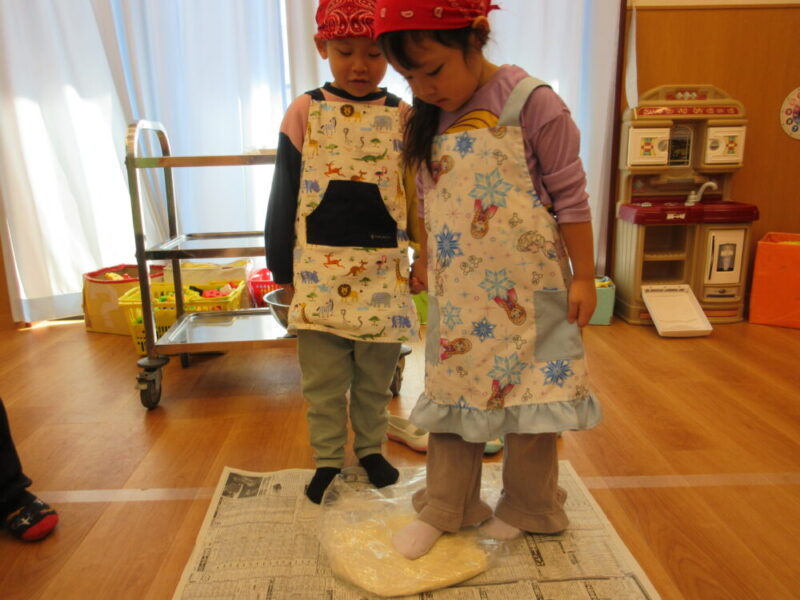 踏み終わった生地は栄養士さんに渡しおやつに持って来てもらうのをお願いしました。