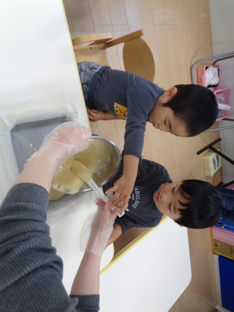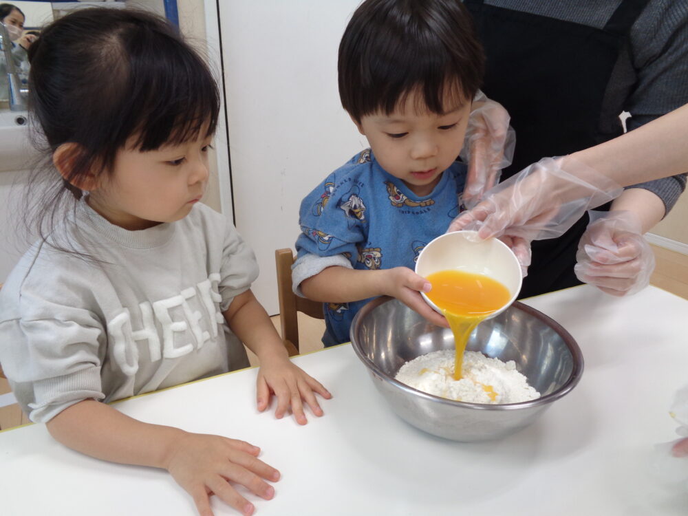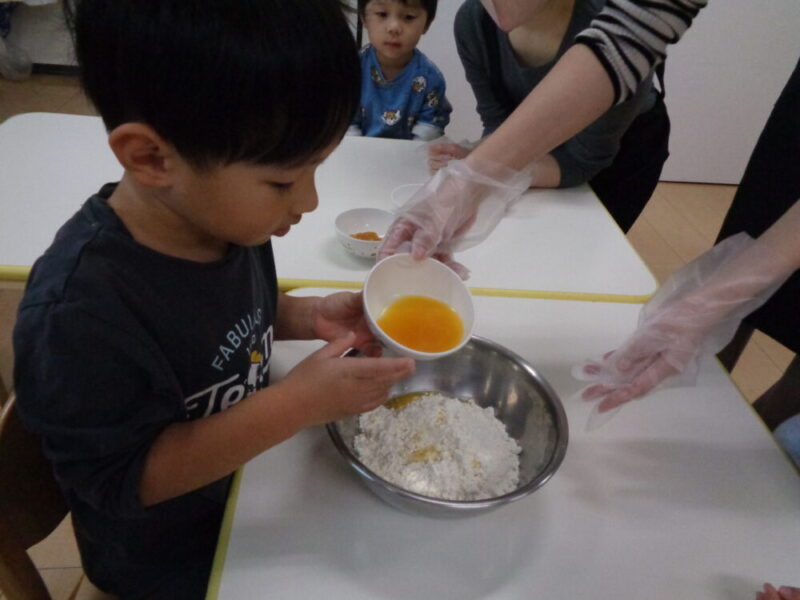 粉の中に材料を順番こでいれました!慎重にいれる、真剣な表情が見られますね💕
