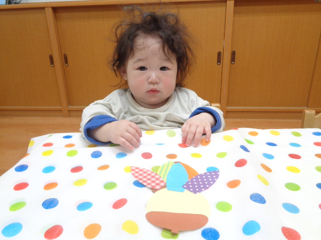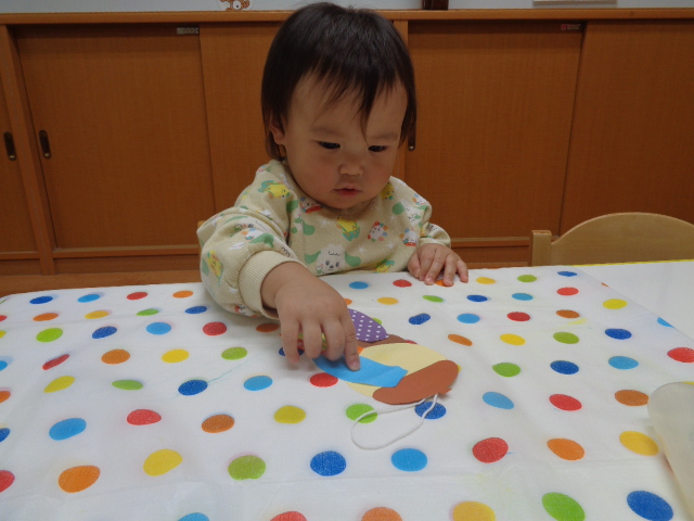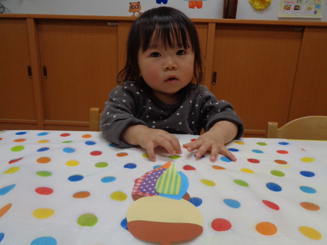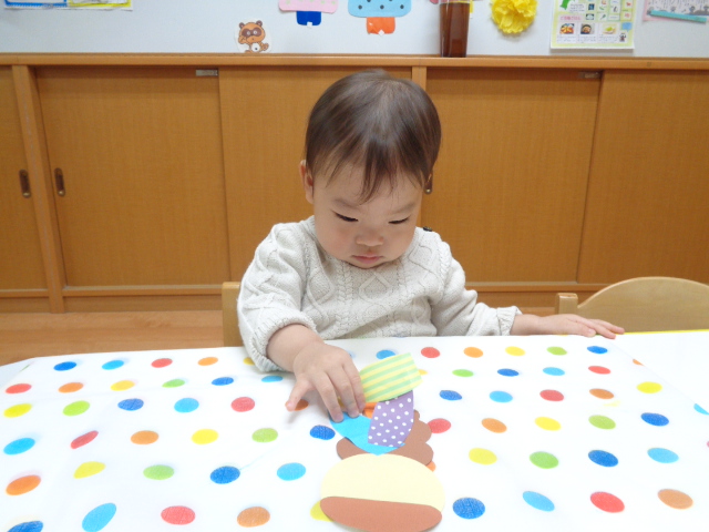 11月の製作でのりを使い、ペッタンとみのむしの体に貼っていきました。