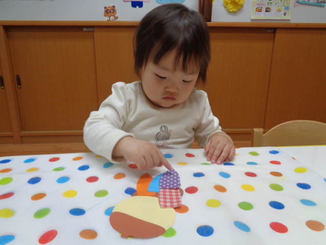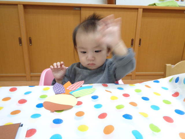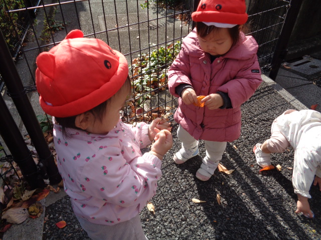 お散歩に電車を見に行くと、紅葉した落ち葉が見られ、落ち葉の方が気になるあひる組でした♪足で踏むと音がしたり、手で揉んで「バリバリ」といっぱい楽しんでいます♪