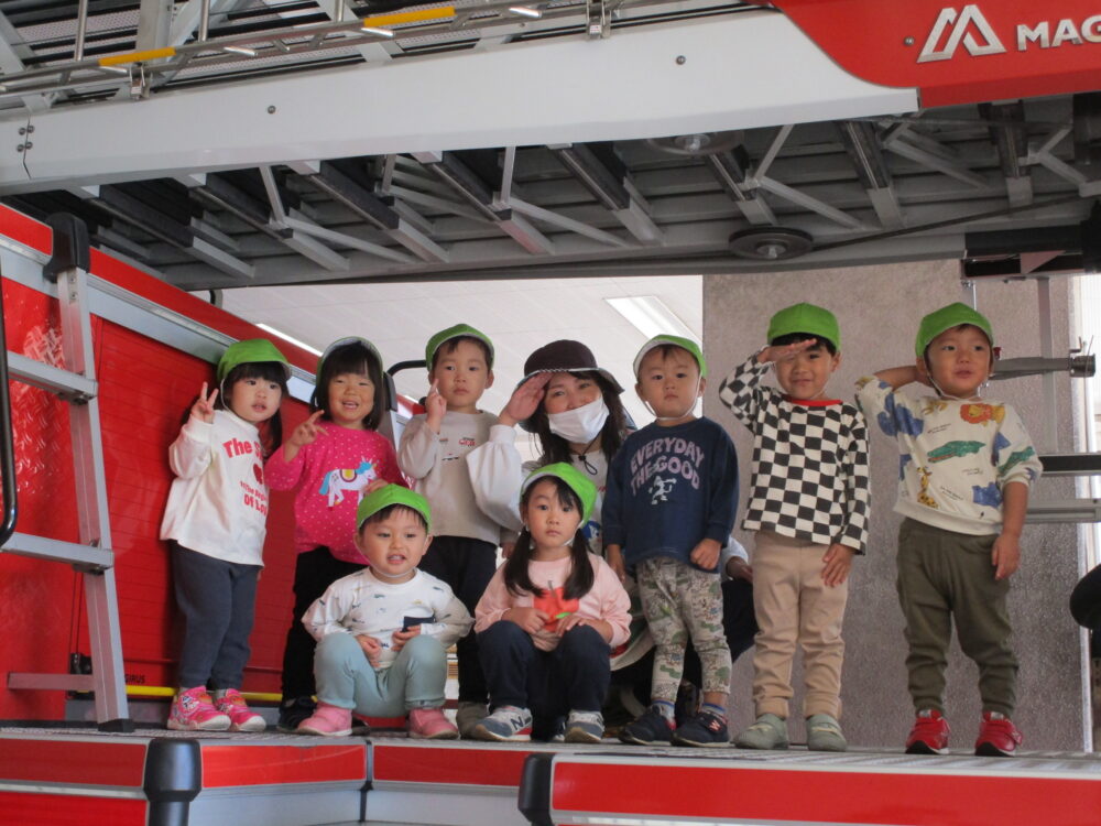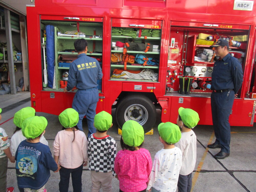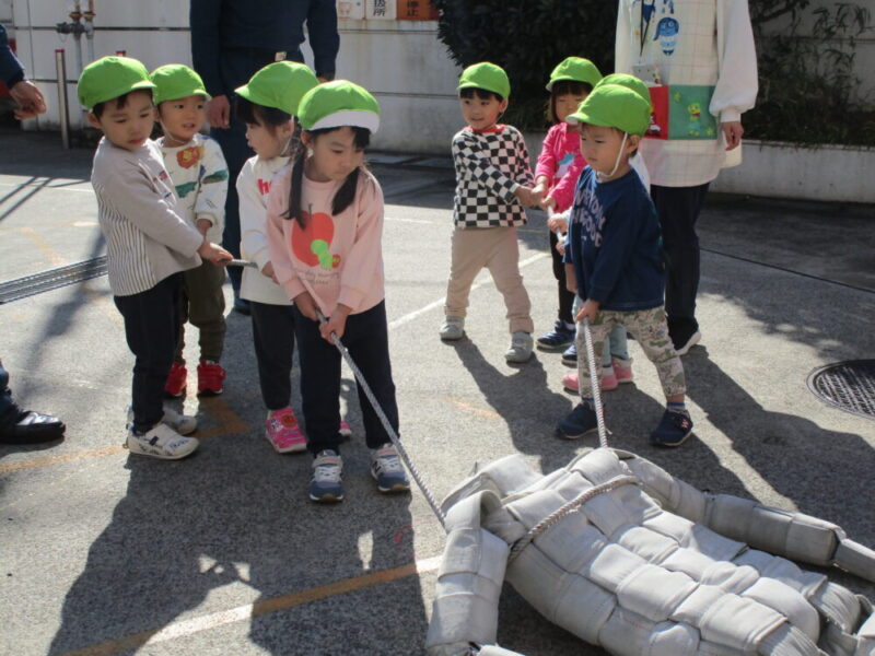 皆が大好きな消防車の中を見せてもらったり、救助する訓練を実際に体験しました。