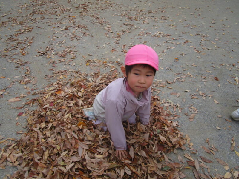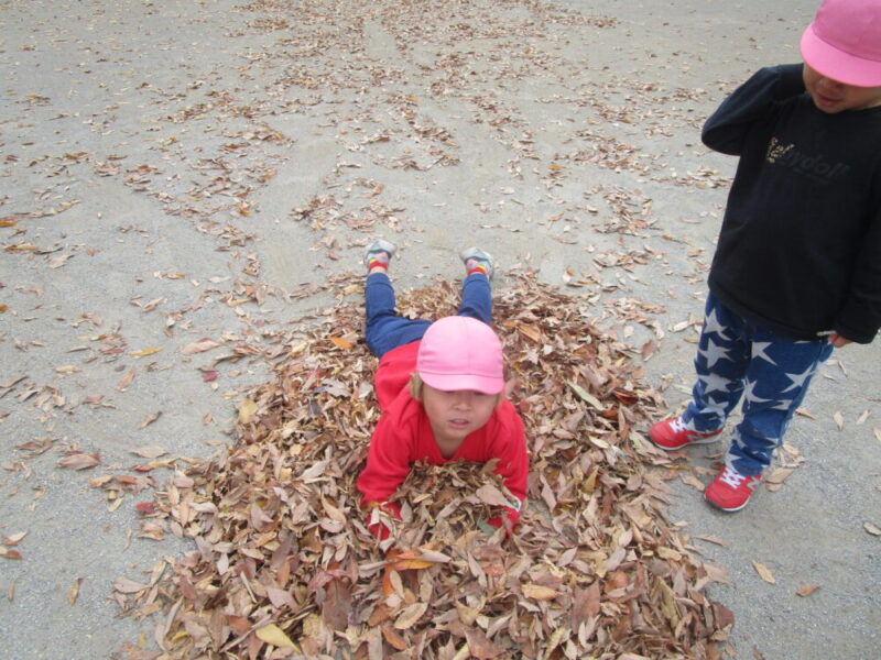 秋は子どもたちにとったら楽しい季節♪どんぐりや落ち葉を存分に使い、戸外で遊んでいます!