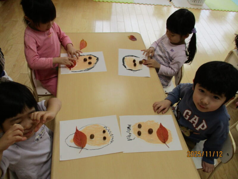 もし、どんぐりが落ちて、小さい子が口に入れたら困るのでお部屋に貼ることにしました。おうちの方には子どもたちがそのことをしっかりと伝えて、廊下から一緒に見て頂いています。