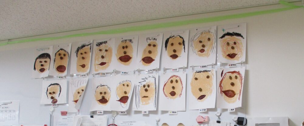 もし、どんぐりが落ちて、小さい子が口に入れたら困るのでお部屋に貼ることにしました。おうちの方には子どもたちがそのことをしっかりと伝えて、廊下から一緒に見て頂いています。