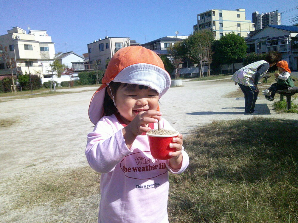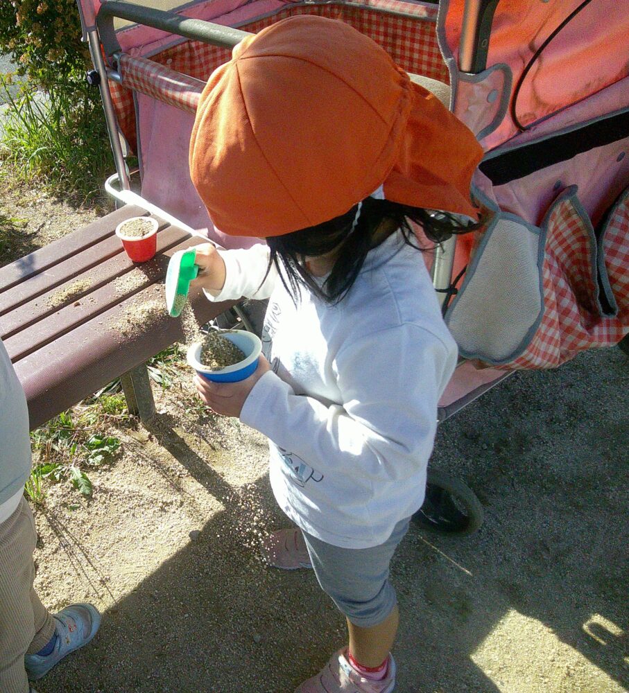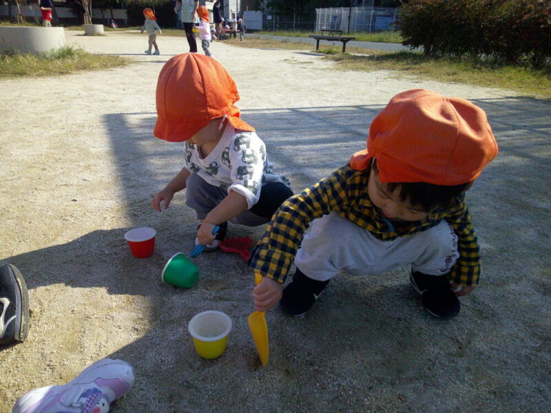 自分たちでスコップを使って上手に砂を掬えるようになり、コップに入れては出してを何度も繰り返し楽しんでいます♪