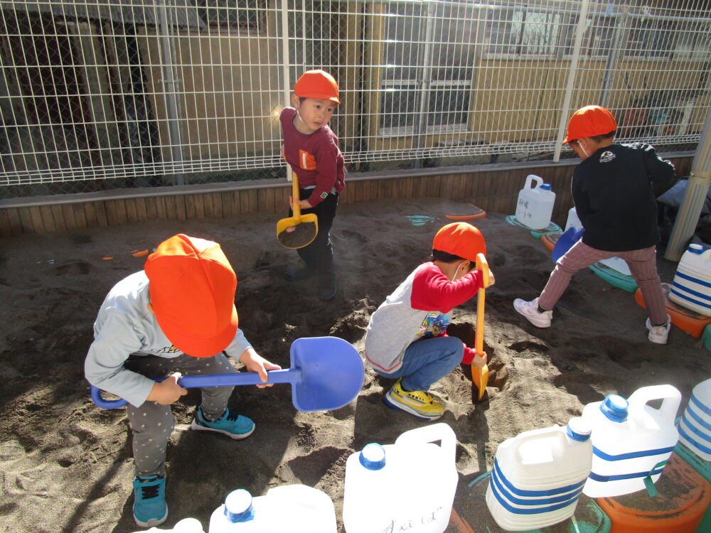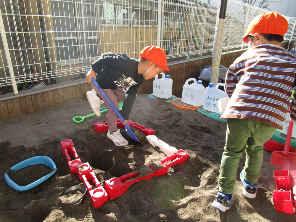 園庭では砂場遊びやボール遊びが人気で、砂場遊びでは工事が始まりました。