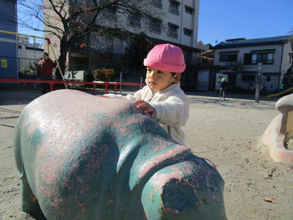さっそく、動物の石像を見つけて触っていました。