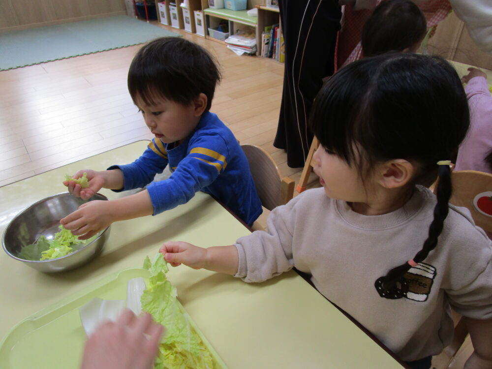 今月の食育第一弾は「白菜をちぎってみよう」です。