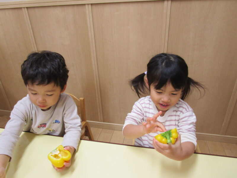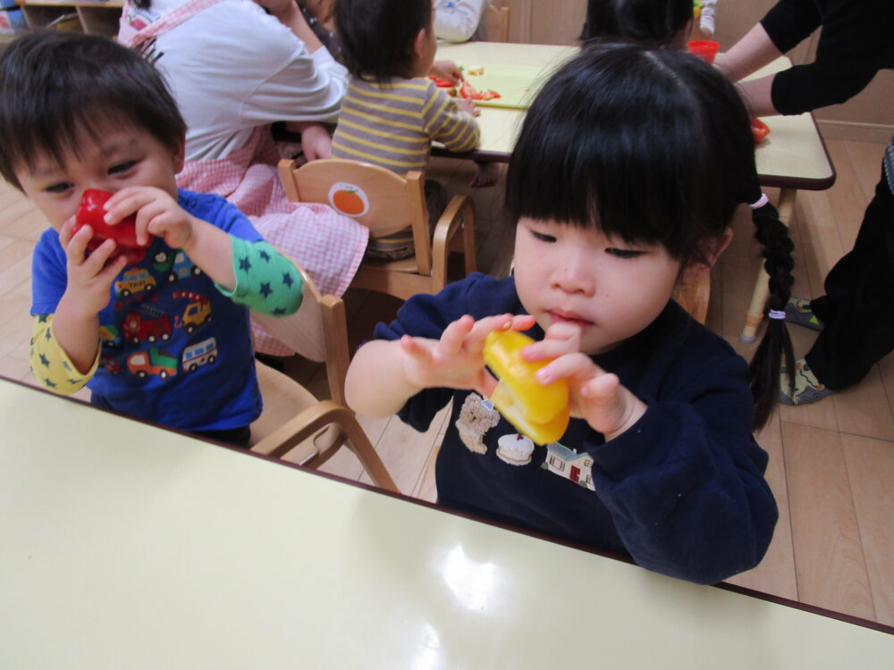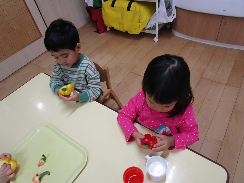 食育2回目は「パプリカのへたを取ってみよう」でした。