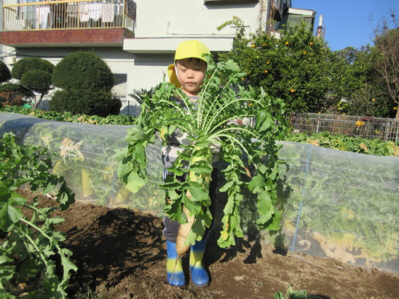 最初は恐る恐る大根を持って採ろうとする姿がありましたが、ポーンと抜けた大きな大根を嬉しそうに「みてみて~!」と見せてくれました!