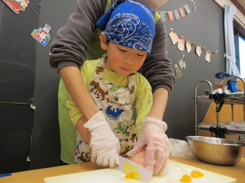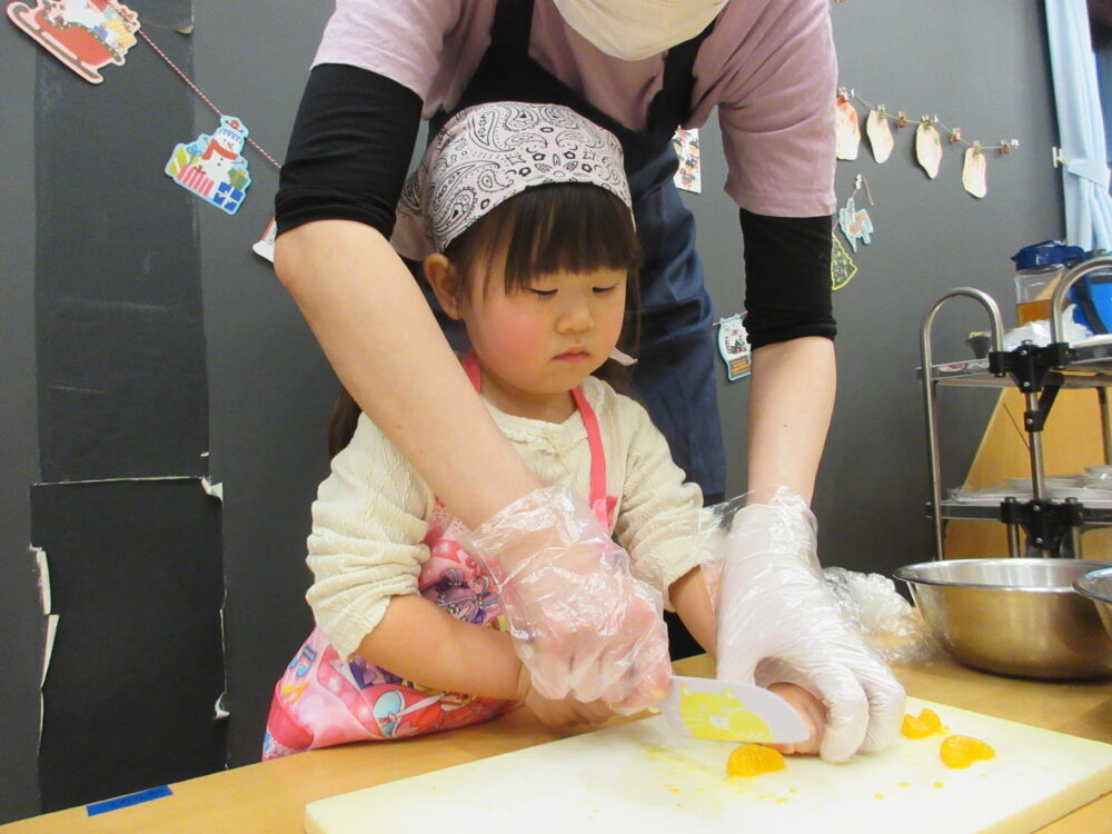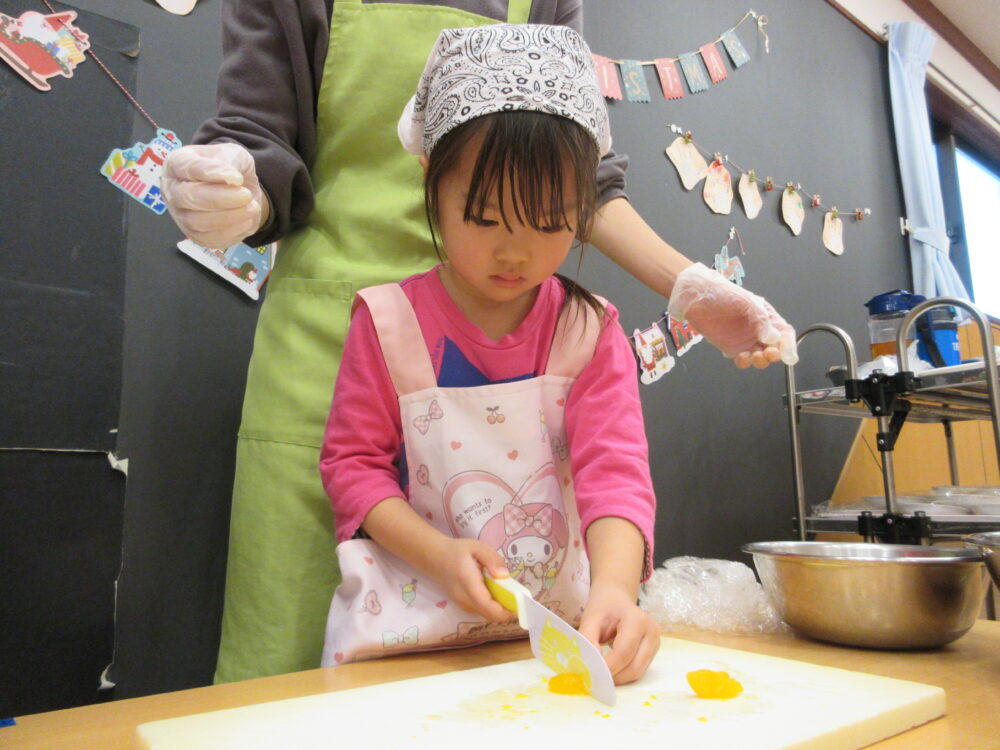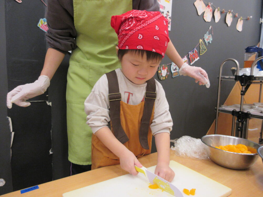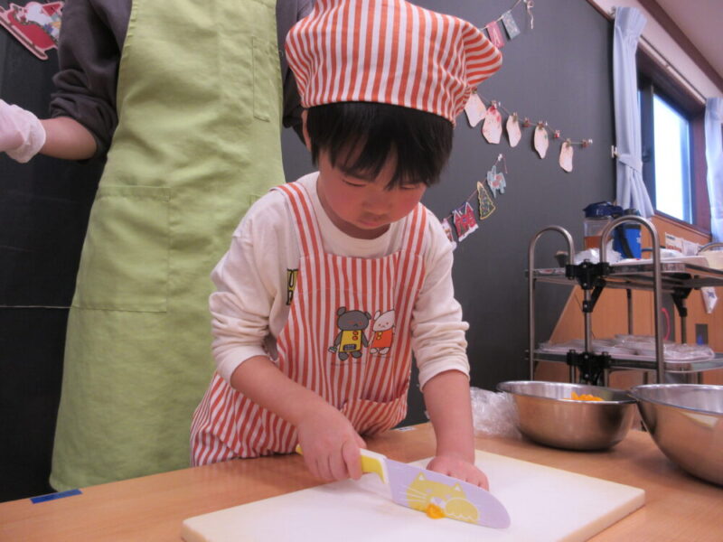 今回は果物を切るということで初めて包丁を使ってみました。危険な所・お約束をきちんと聞き順番に切ってみました!(子どもたちはみかんを切りました🍊)