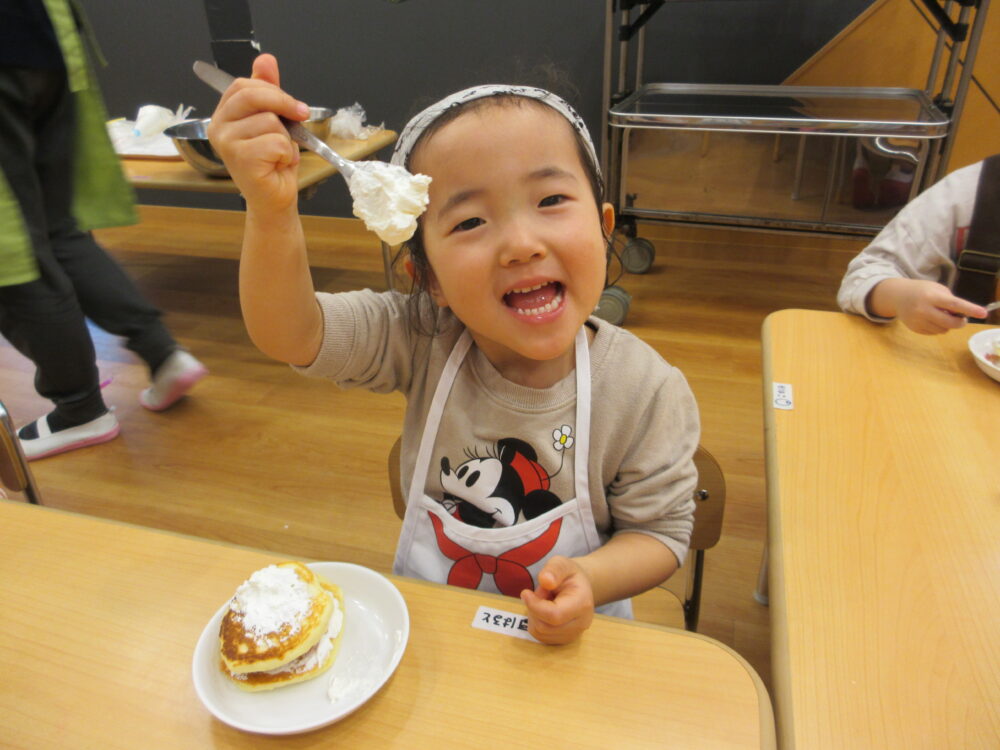 切り終わった後はパンケーキの上にクリームを塗ります!