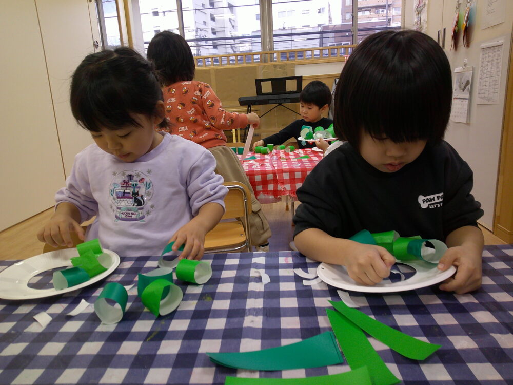 糊で緑の折り紙を丸めてくっ付けて、ドーナツ状の紙皿に貼りました!