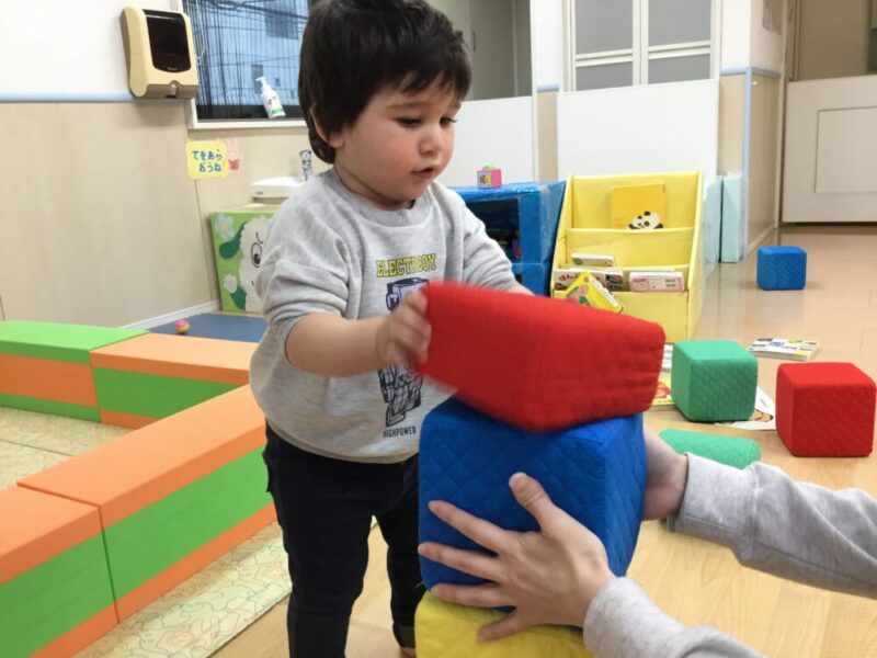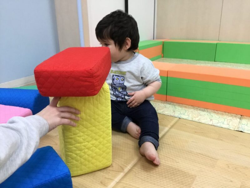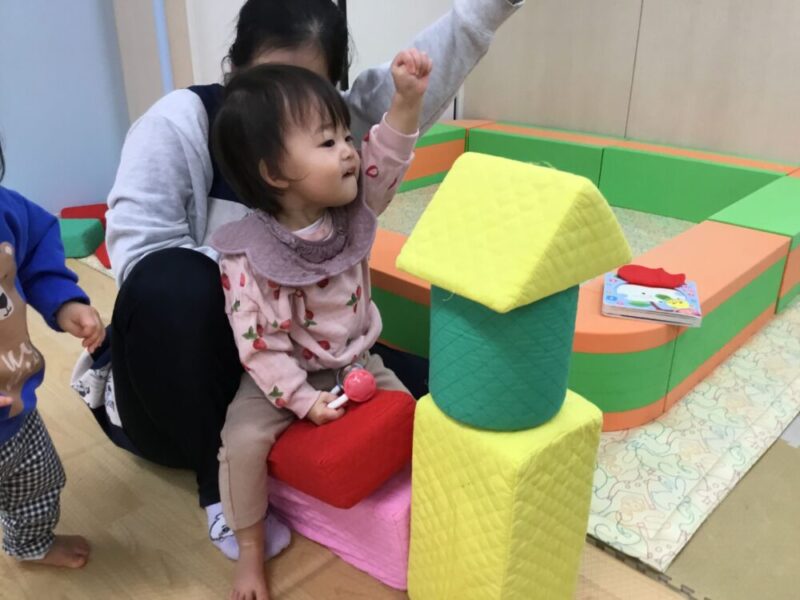 この日は雨のため、クッション積み木で遊びました。大きな積み木に大興奮の子どもたち!自分で積み上げることにチャレンジしていました✨