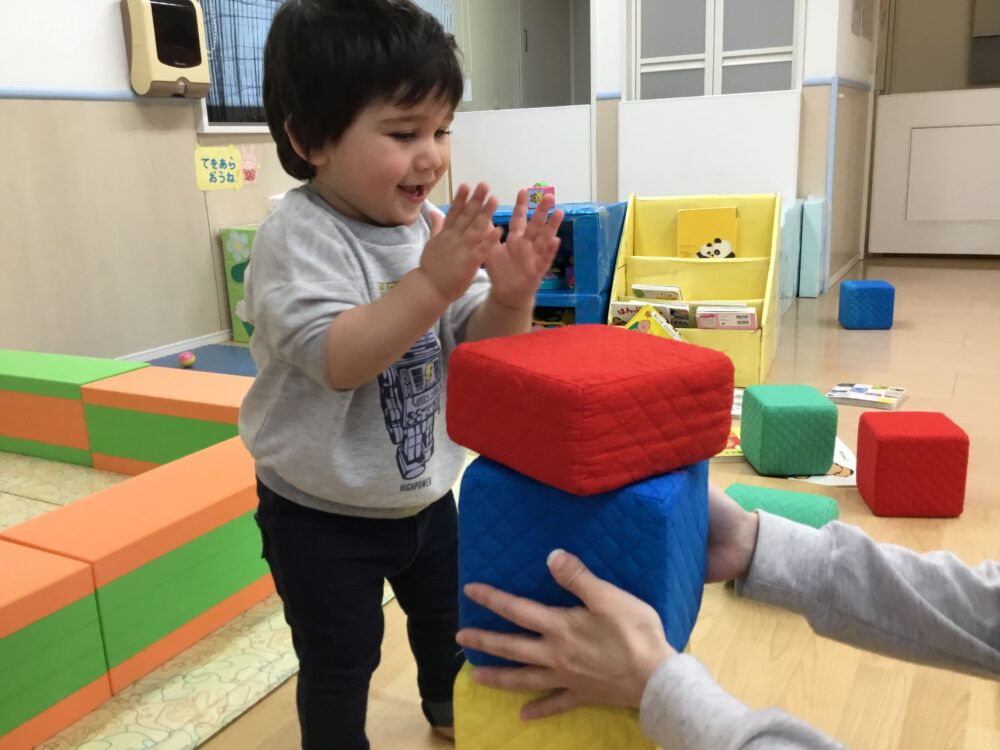 慎重に積み上げ、「できた~!」と喜びの拍手👏