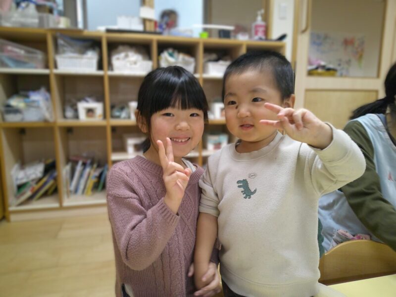 乳児さんとの関わり方が分からず、少しぎこちなくなりながらも、優しく目線を合わせたり、玩具を渡してあげたり楽しんでいました。