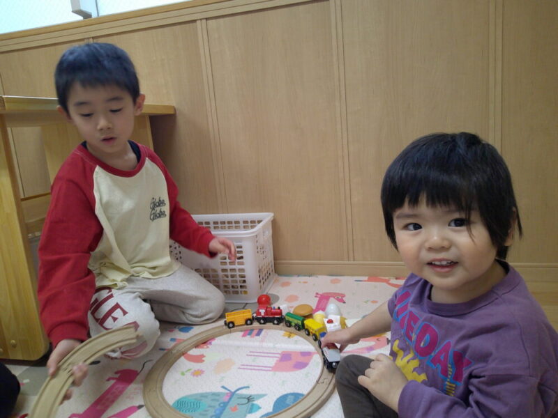 そら組さんに線路の広げ方を教えてあげたい様子でしたが、教え方が分からずどんどん作り始めるお兄さん。その姿を見ながら、そら組さんは作り方を知ることができ、嬉しそうでした。すれ違っているようで重なり合うことができていて良かったです。