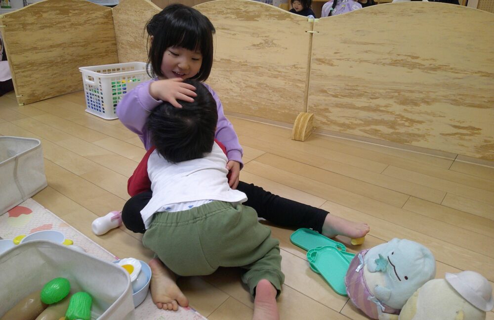 お姉さんにぎゅっと甘える姿もありました。その姿が可愛らしく思わず頭をなでなでしていました。
