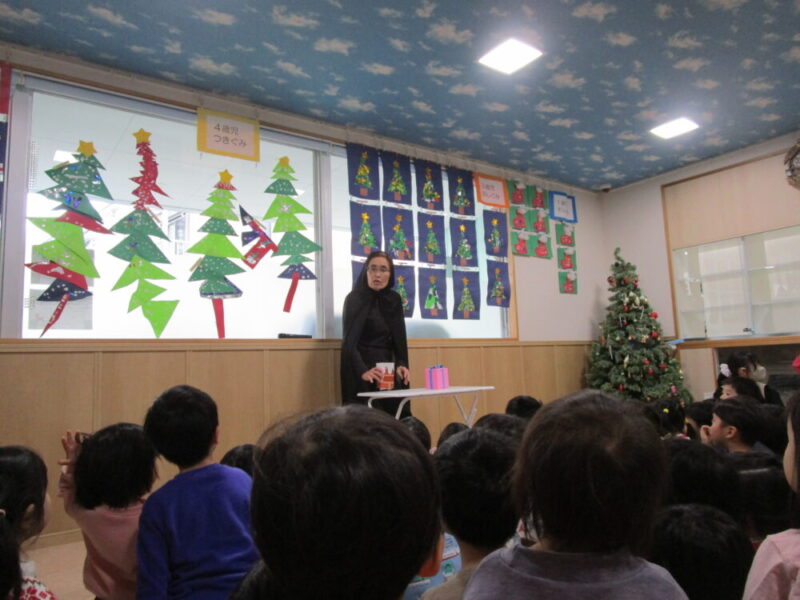 職員の出し物ではマジシャンに変身!たくさんのマジックを披露してくれました。煙突から突然サンタが出てきたり、プレゼントボックスからケーキが出てきたり、手品にみんな釘付けです。