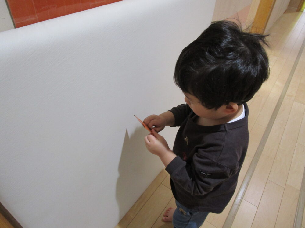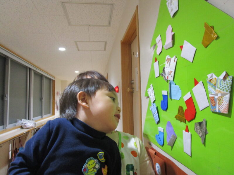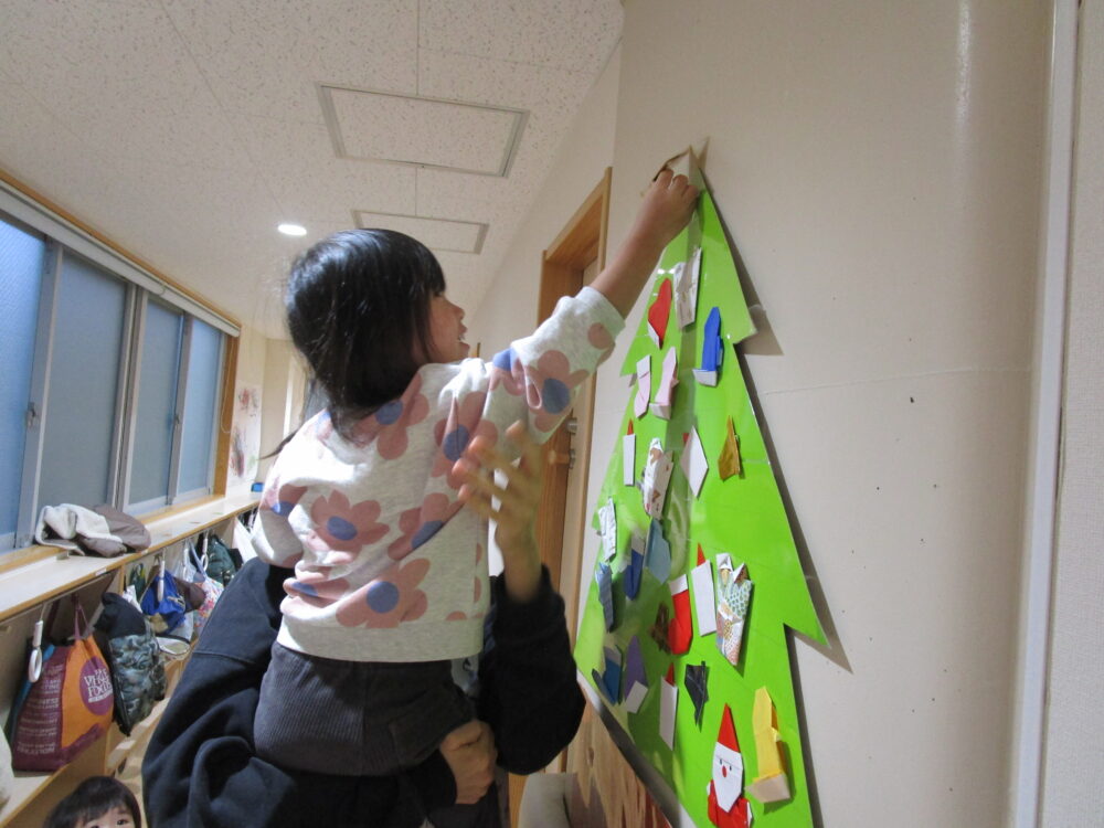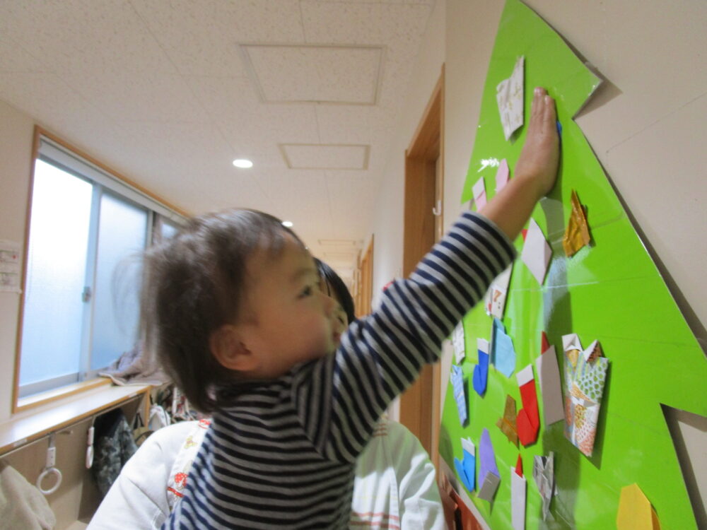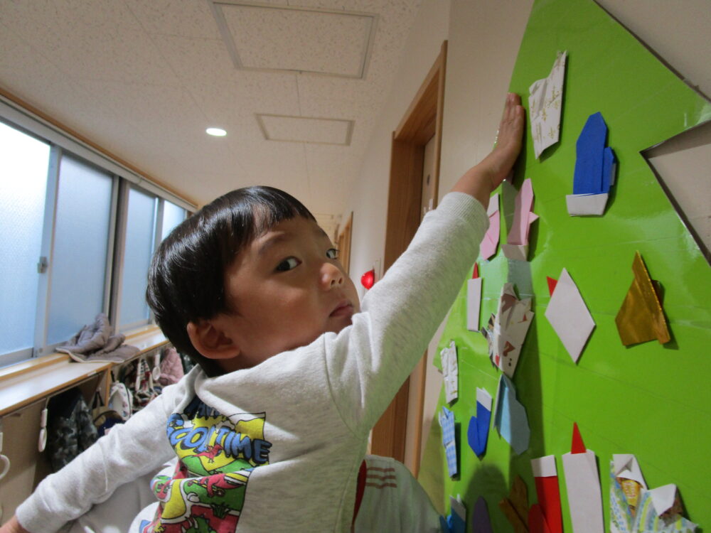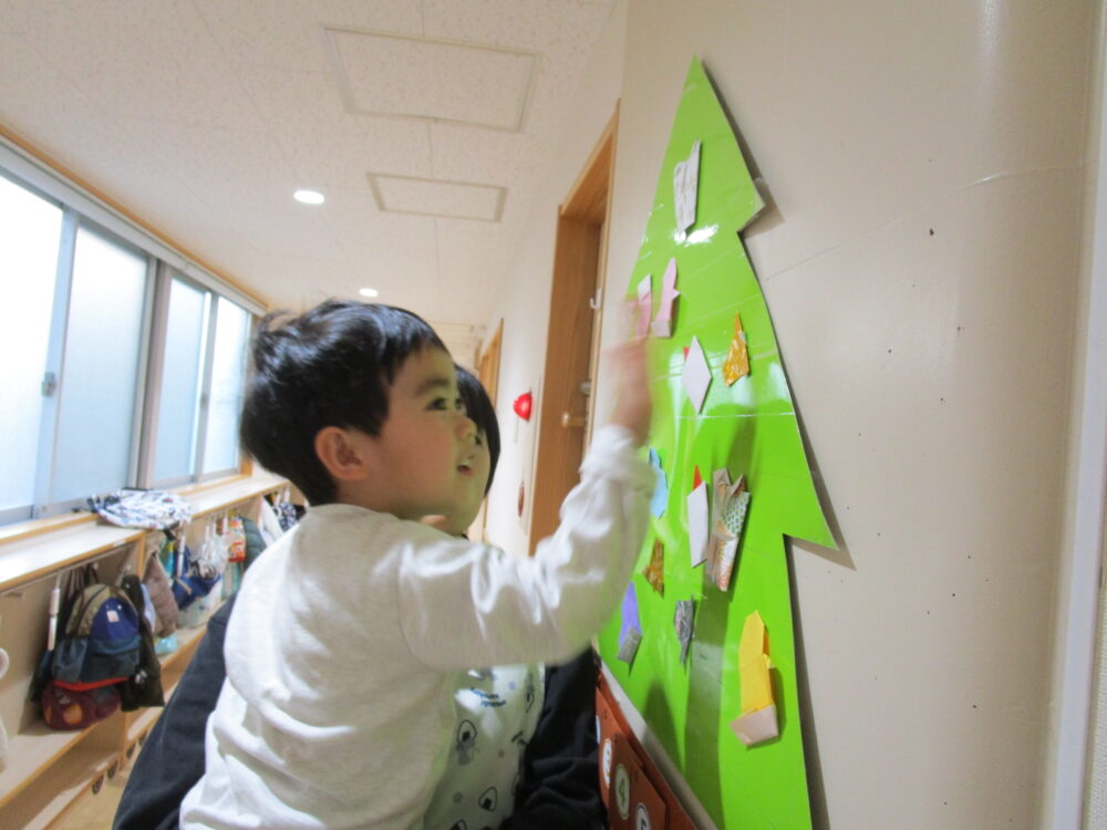 高い所に付けたり低い所に着けたり自由に付けました。最後に一番上に星を付けて完成!出来上がると皆で喜んでいました。